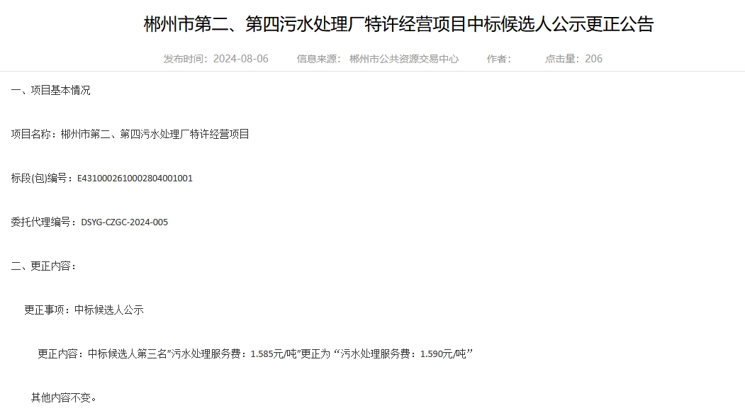 8月6日,郴州市第二、第四污水处理厂特许经营项目中标候选人公示。中标候选人情况如下: