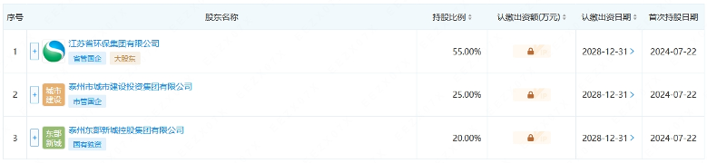 企查查显示,江苏泰州环保产业发展有限公司注册资本5亿元,法定代表人为刘晓冬。股权信息显示,该公司由江苏省环保集团与泰州市政府共同成立,江苏省环保集团控股。其中江苏省环保集团有限公司持股55.00%;泰州市城市建设投资集团有限公司持股25.00%;泰州东部新城控股集团有限公司持股20.00%。