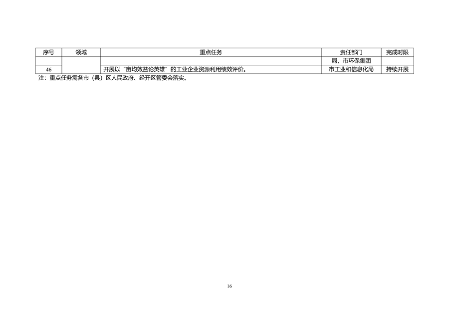 超前谋划减污降碳协同推进工作,在国土空间规划中预留污水处理厂尾水湿地、“绿岛”项目等环境基础设施建设用地。〔责任单位:市自然资源规划局〕深入开展以“亩均效益论英雄”的工业企业资源利用绩效评价,通过在项目扶持、土地供给、排污、用电、用水等方面实施差别化政策,推动资源要素向优质企业和特色产业集群集聚。〔责任单位:市工业和信息化局〕